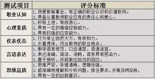 评价标准主要来考察面试者的职业认知、心理素质、仪表仪态、言语表达、思维品质等基本素养。